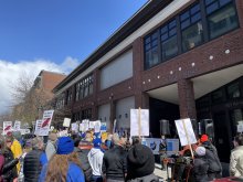 Signs and members in front of the Siegal Center. Photo credit Javier Cortez.